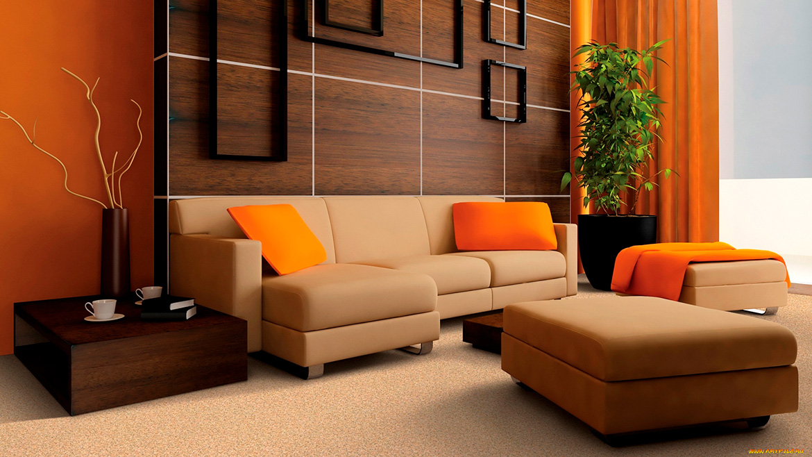 - Гостиную украсят оранжевые шторы любых оттенков, сторонитесь только классических стилей в интерьере. Комбинировать занавеси стоит с белым или пастельным тюлем – окно будет выглядеть объемным и заполнит пространство комнаты. Стены могут быть окрашены в голубой цвет или оклеены «холодными» обоями – оранжевый как раз и призван оживить атмосферу и добавить красок подобному дизайну.Сине-апельсиновые или морковно-фиолетовые сочетания будут смотреться очень красиво и необычно. Красивое сочетание — с дозированным черным цветом. Оранжевый сильно оттеняет черный, не случайно такое сочетание широко применялось в средиземноморских, восточных стилях, в мексиканском интерьере.Черная мебель станет ослепительной на фоне оранжевого – такой тандем может придать некоторый флер «коллективного бессознательного» помещению.